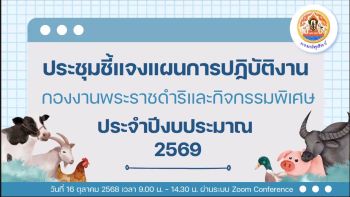 วันที่ 16 ตุลาคม 2568 สัตวแพทย์หญิงขนิษฐา ธิติดิลกรัตน์ ปศุสัตว์เขต 1 มอบหมายให้ส่วนส่งเสริมและพัฒนาการปศุสัตว์ เข้าร่วมประชุมชี้แจงแผนการปฏิบัติงาน/โครงการ กองงานพระราชดำริ ประจำปีงบประมาณ 2569 โดยมีนายธีรวิทย์ ขาวบุบผา ผู้อำนวยการกองงานพระราชดำริและกิจกรรมพิเศษ เป็นประธานในการประชุม และมีเจ้าหน้าที่ผู้รับผิดชอบโครงการ/กิจกรรม ของปศุสัตว์เขตและสำนักงานปศุสัตว์จังหวัด เข้าร่วมประชุมครั้งนี้ด้วย