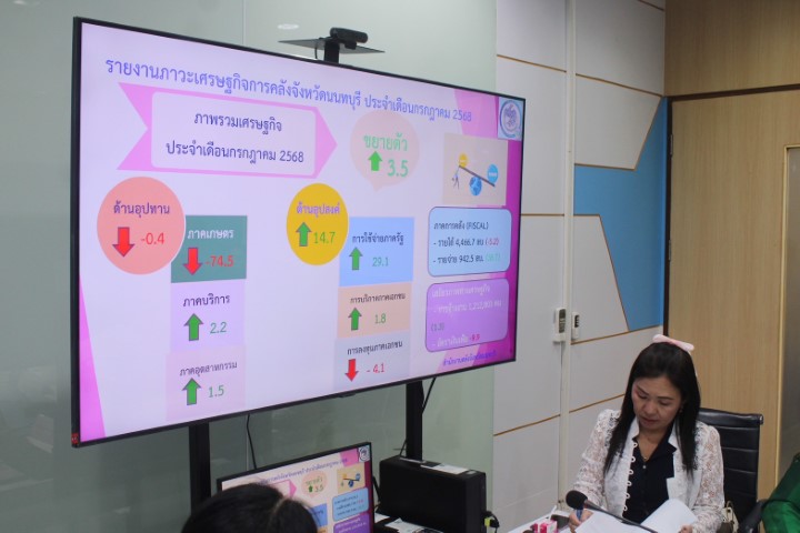 วันศุกร์ที่ 3 ตุลาคม 2568 นายสัตวแพทย์เชิงชาญ พึ่งเจียม ปศุสัตว์จังหวัดนนทบุรี มอบหมายให้กลุ่มส่งเสริมและพัฒนาการปศุสัตว์เข้าร่วมการประชุมพิจารณาข้อมูลและให้ข้อคิดเห็นต่อรายงานประมาณการเศรษฐกิจจังหวัดนนทบุรี ปี 2568 (ณ เดือนกันยายน 2568) ไตรมาส 3 โดยมีผู้เชี่ยวชาญจากหน่วยงานทั้งภาครัฐและภาคเอกชนที่มีความเกี่ยวข้องกับข้อมูลเศรษฐกิจจังหวัดร่วมพิจารณากลั่นกรองข้อมูลให้ความคิดเห็นและข้อเสนอแนะต่อรายงานประมาณการเศรษฐกิจ เพื่อให้รายงานประมาณการเศรษฐกิจจังหวัดนนทบุรีมีความสมบูรณ์ ถูกต้อง น่าเชื่อถือ และสนับสนุนการพัฒนาเศรษฐกิจของจังหวัดนนทบุรีได้อย่างมีประสิทธิภาพ ณ ห้องประชุมสำนักงานคลังจังหวัดนนทบุรี ชั้น 1 อาคารศาลากลางจังหวัดนนทบุรี