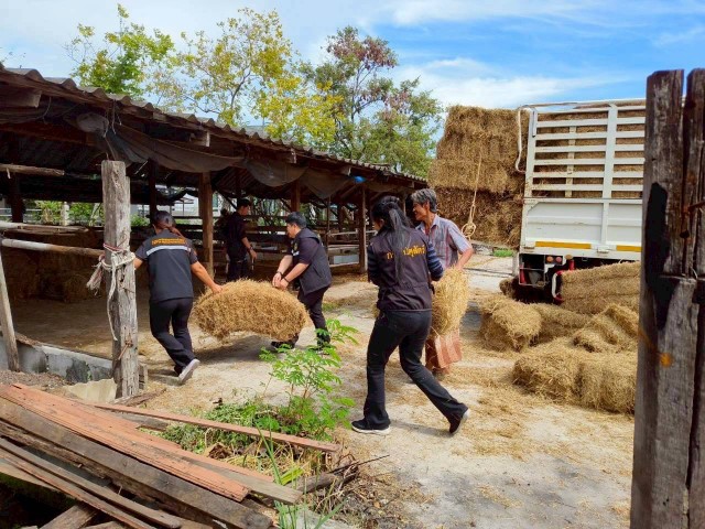 วันพุธที่ 19 พฤศจิกายน 2568 ครอบครัวปศุสัตว์นนทบุรี โดยนายสัตวแพทย์เชิงชาญ พึ่งเจียม ปศุสัตว์จังหวัดนนทบุรี พร้อมด้วยกลุ่มยุทธศาสตร์และสารสนเทศการปศุสัตว์ กลุ่มส่งเสริมและพัฒนาการปศุสัตว์ สำนักงานปศุสัตว์อำเภอปากเกร็ด สำนักงานปศุสัตว์อำเภอเมืองนนทบุรี และสำนักงานปศุสัตว์อำเภอบางบัวทอง ลงพื้นที่มอบเสบียงอาหารสัตว์ประเภทหญ้าแพงโกลาแห้ง จำนวน 250 ฟ่อน (5,000 กิโลกรัม) ซึ่งได้รับการสนับสนุนจากศูนย์วิจัยและพัฒนาอาหารสัตว์ชัยนาท พร้อมทั้งเวชภัณฑ์ ยา และแร่ธาตุก้อน เพื่อช่วยเหลือเกษตรกรผู้เลี้ยงสัตว์ที่ได้รับผลกระทบจากการเพิ่มปริมาณการระบายน้ำของแม่น้ำเจ้าพระยา ประกอบกับฝนตกหนักต่อเนื่องหลายวัน ทำให้เกิดน้ำเอ่อล้นตลิ่งเข้าท่วมบ้านเรือนและแปลงพืชอาหารสัตว์ โดยมีเกษตรกรในพื้นที่อำเภอปากเกร็ด อำเภอเมืองนนทบุรี และอำเภอบางบัวทองที่ได้รับผลกระทบรวมทั้งสิ้น 47 ราย โค-กระบือรวม 196 ตัว เเพะ-แกะรวม 528 ตัว นอกจากนี้ยังได้ให้คำแนะนำด้านการดูแลสุขภาพสัตว์ การเฝ้าระวังโรคระบาด รวมทั้งการจัดการฟาร์ม เพื่อป้องกันความสูญเสียด้านปศุสัตว์และลดผลกระทบที่อาจจะเกิดขึ้นในสถานการณ์ดังกล่าว