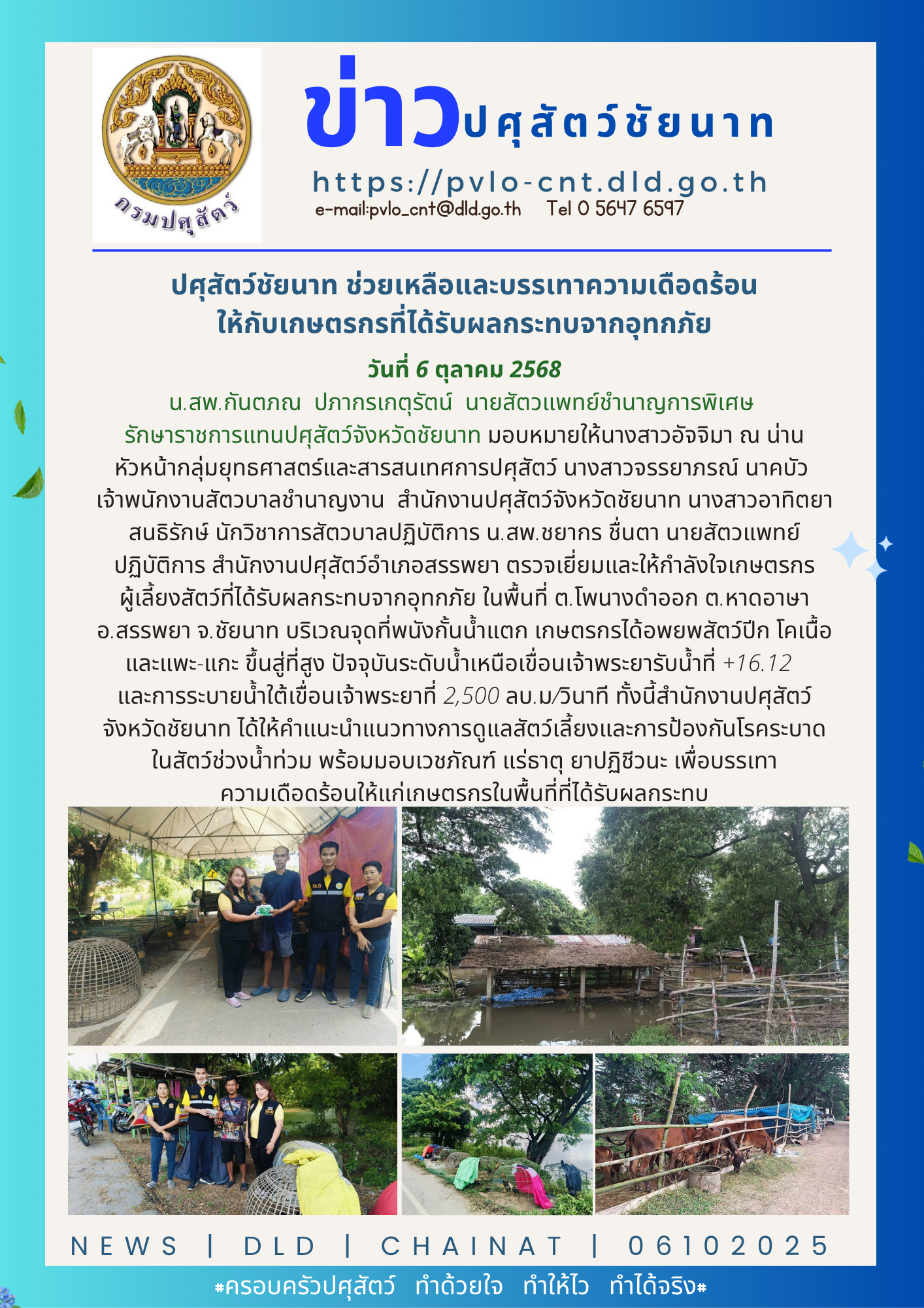 ปศุสัตว์ชัยนาท ช่วยเหลือและบรรเทาความเดือดร้อนให้กับเกษตรกรที่ได้รับผลกระทบจากอุทกภัย