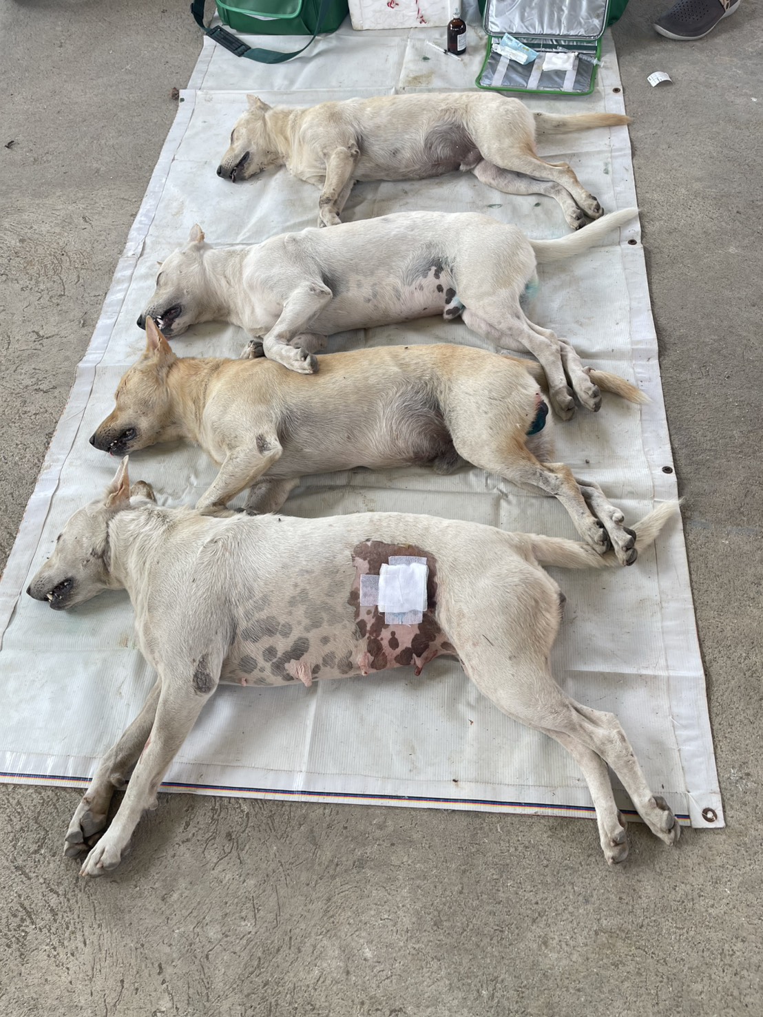 สุนัขผู้ 5 ตัว สุนัขเพศเมีย 1 ตัว แมวเพศผู้ 1 ตัว แมวเพศเมีย 1 ตัว รวมทำหมันสุนัขและแมวทั้งสิ้น 8 ตัว