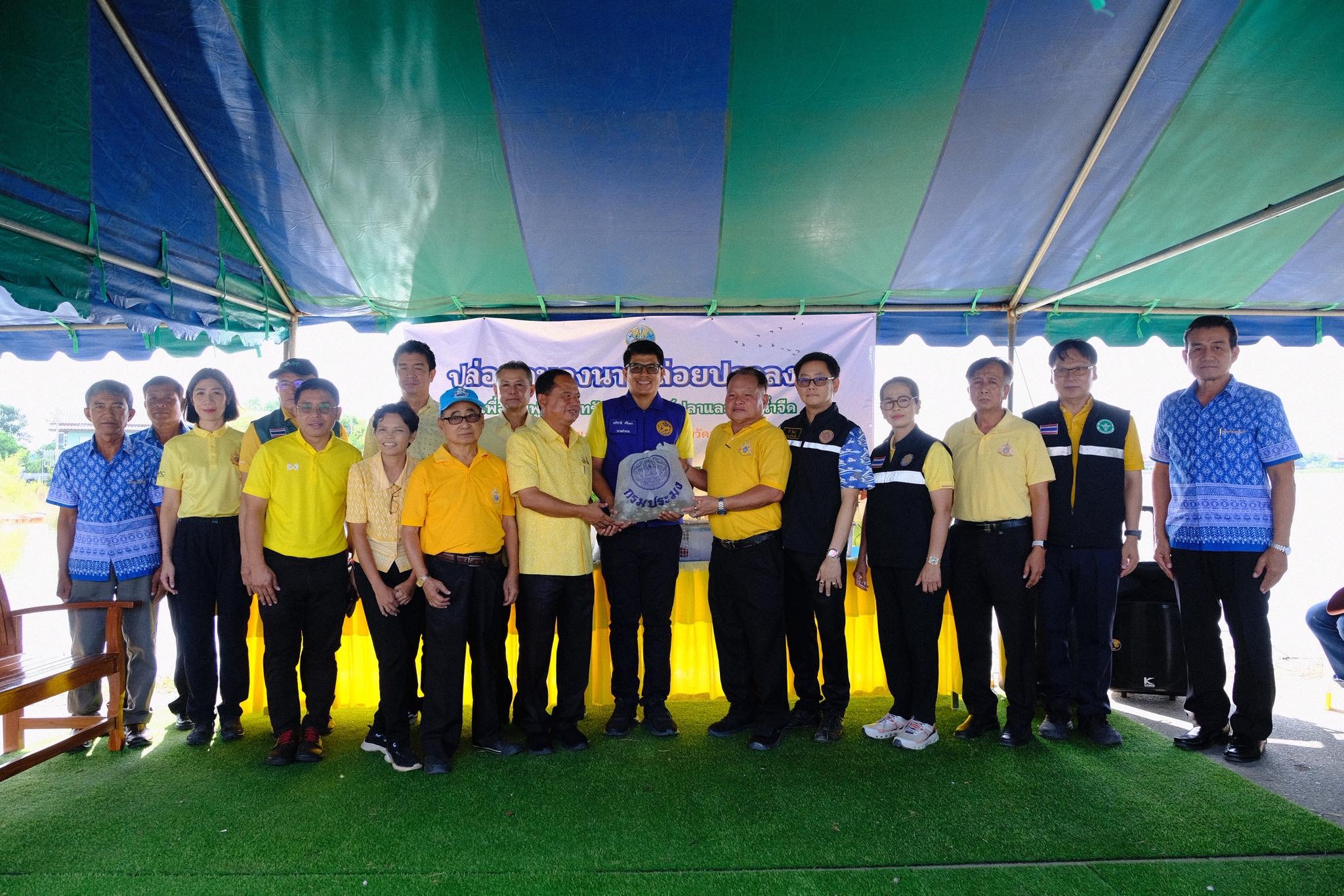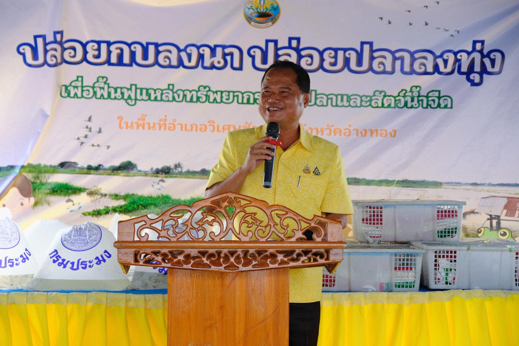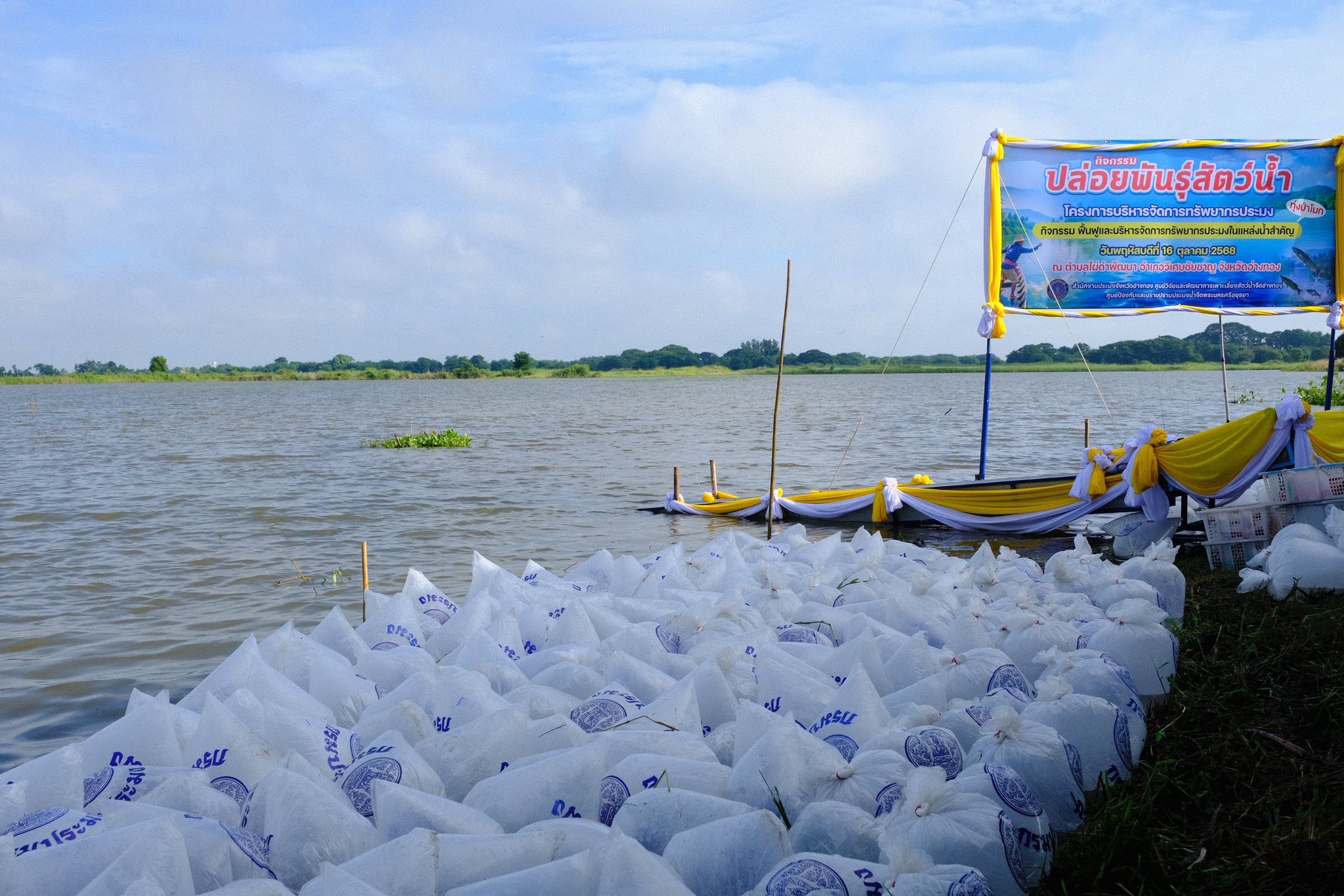 วันที่ 16 ตุลาคม 2568 นายวิเชียร จารุเพ็ง ได้มอบหมายให้นางสาววธู ทดเพชร นายสัตวแพทย์ชำนาญการรักษาการในตำแหน่งปศุสัตว์อำเภอวิเศษชัยชาญ เข้าร่วมพิธีปล่อยปลา ตามกิจกรรม "ปล่อยกบลงนา ปล่อยปลาลงทุ่ง" เพื่อฟื้นฟูแหล่งทรัพยากรพันธุ์ปลาและสัตว์น้ำจืด โดยมีนายไพบูลย์ ศุภบุญ รองผู้ว่าราชการจังหวัดอ่างทอง เป็นประธาน โดยปล่อยพันธุ์ปลาและพันธุ์กุ้ง จำนวน 200,000 ตัว และพันธุ์กบ จำนวน 2,000 ตัว ลงสู่ทุ่งรับน้ำ เพื่อเพาะเลี้ยงและขยายพันธุ์แหล่งทรัพยากรให้อุดมสมบูรณ์ สร้างรายได้และความมั่นคงทางอาหารให้แก่ชุมชน ซึ่งได้รับการสนับสนุนพันธุ์สัตว์น้ำจากสำนักงานประมงจังหวัดอ่างทอง ศูนย์วิจัยและพัฒนาการเพาะเลี้ยงสัตว์น้ำจืดอ่างทอง และหจก.เสรีภาพการเกษตร อำเภอบางปลาม้า จังหวัดสุพรรณบุรี ณ
